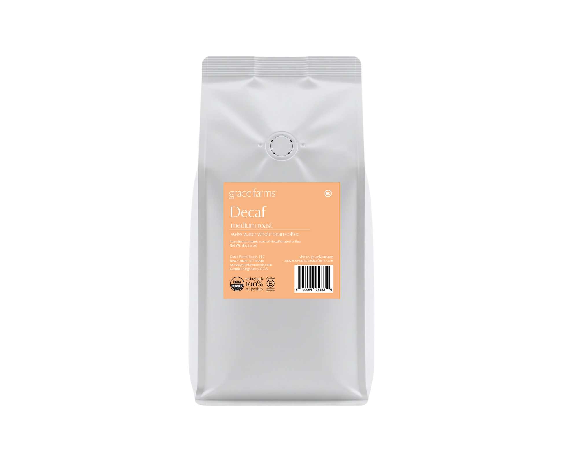 Grace Farms Organic Decaf Whole Bean Coffee available in 2lb. bags. Our decaf coffee naturally has the caffeine extracted using the Swiss Water Process® without the use of chemicals or gasses preserving a full-bodied taste.
